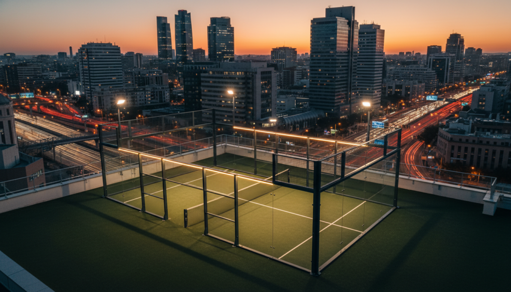 Aquí está lo interesante: el pádel ocupa la mitad de espacio que el tenis, ideal para suelos limitados en urbes. Pistas de 20×10 metros, con paredes de cristal y malla que permiten rebotes hasta 4 metros –eso añade táctica sin necesidad de canchas enormes. En entornos urbanos, se adapta a rooftops con iluminación LED y altura libre de más de 6 metros, cumpliendo normas de seguridad contra viento o nieve. En EE.UU., Florida y California lideran con 352 pistas nuevas en 2024; en Asia, India e Indonesia planean 200 para 2025.